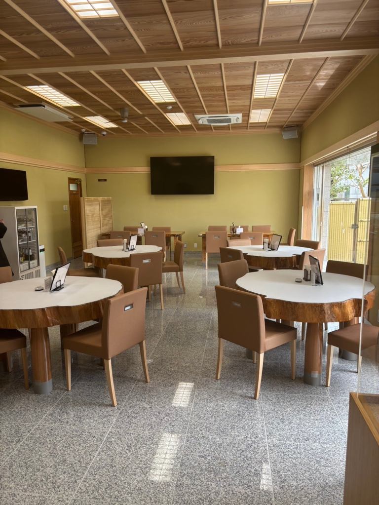 美術館併設のカフェスペースです。もちろんお食事のみのご利用も大歓迎です。テーブルや天井等は屋久杉で作られています。